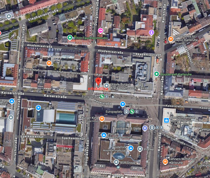 Kaiserstraße 158, 76133 Karlsruhe, direkt am Europaplatz.